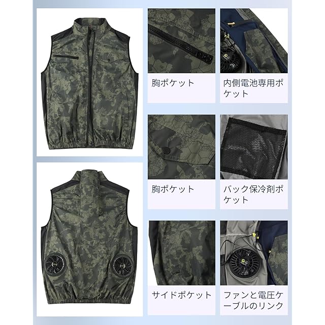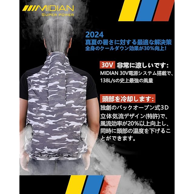 [MIDIAN] 2024年夏-30V超強力 138L/S爆風 空調作業服 ファンバッテリーセット付きファン付き作業ベスト防水・防汚・速乾作業着UVカットチタンコーティング大風量の背面風路熱中症対策(グレー迷彩ベスト+2XL)