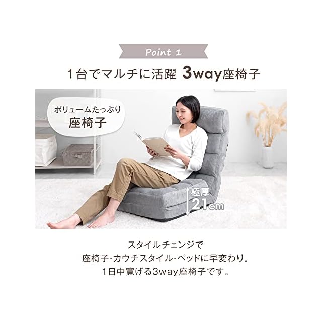 【スタッフのおすすめポイント!】・シーンに合わせてスタイルチェンジ!3way座椅子 座椅子・カウチ・ベッドにスタイルチェンジ ・大人かわいいニュアンスカラー ・もこもこキルティングで座り心地◎ ・リクライニング42段階+ヘッドリクライニング5段階 ・高い品質と耐久力を誇る日本メーカーのギア使用 ・肌触りの良いマイヤー生地 ・折り畳み収納OK