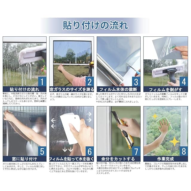 【適用ガラスタイプ】全ての滑らかな表面(凹凸がない)ガラスに適用です。木材、タイルやすりガラスなど粗い表面と多孔性表面のガラスに適用しません。ペアガラス(二重ガラス)と網入りガラスみたいの構造でも、表面が平ら(ツイツル)でしたら、綺麗に貼れますので、ご安心ください。
