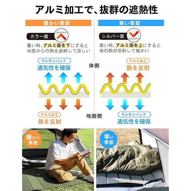 ✅【”アルミ加工”でオールシーズン快適な睡眠を】アルミ加工が施されている銀マットは夏と冬で使い分けることが可能!夏はアルミ面を下して地面からの熱を遮断し、冬はアルミ面を上にして自身の体温を反射して温かさを保つことができます。