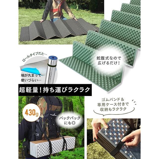 ✅【軽量コンパクトで持ち運び〇】約430gと軽量で、折りたたみ式で収納も簡単です。折りたためばコンパクトになり、バックパックに括りつけても難なく持ち運ぶことができます。折りたたみ式は、使用面を汚すことなく収納でき、使うときも片付けるときも簡単なのもポイントです。