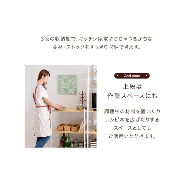 【スタッフのおすすめポイント】・食器や家電をすっきり収納 ・大型レンジも置けるゆったりサイズ ・使い勝手の良いスライド棚 ・長く使える高耐荷重設計 ・熱、キズ、汚れに強いメラミン天板 ・フレームはサビに強い粉体塗装仕上げ