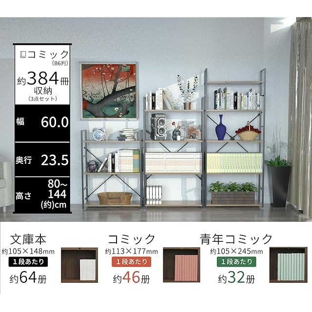 ★【商品サイズ】幅58.6×奥行23.5×高さ112cm。商品重量:5.96kg。耐荷重(約):棚板各15kg。材質:MDF・スチール。色:ブラック