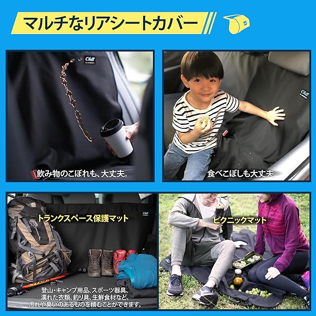 【多機能リアシートカバー】 座椅保護からアウトドアマットまで、驚くべき使い方が広がります! 裏返せばリアシートの保護パッド/キャンプ用ピクニックマットとして使用可能。防水・防汚効果があり、車内の汚れを気にすることなく、釣り、登山、キャンプ、ビーチでのアクティビティなどに使用するさまざまな道具や用具を積み込むことができます。キャンプ用のピクニックマットとしてもお使いいただけます。車でアウトドアへピクニックに行く際、後部座席からサッと外して芝生の上に敷くだけでChillによるピクニックタイムを楽しむことができます。
