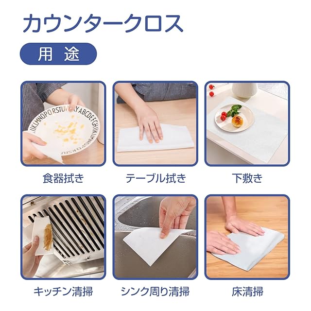 食器拭き、カウンターやテーブルのふきん、食品加工時の水分と油分の吸収、調理時のふきん、窓やショーケースなどの拭き掃除。
