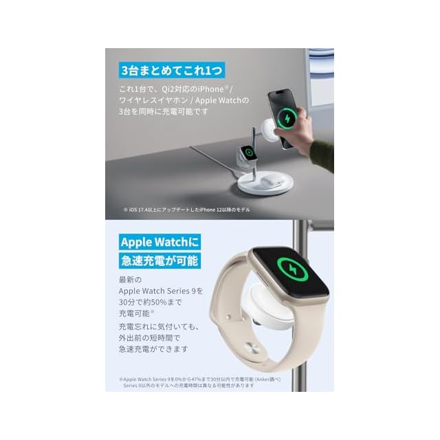 3台まとめてこれ1つ:これ1台で、Qi2対応スマートフォンやワイヤレスイヤホン、Apple Watchの3台を同時に充電可能です。