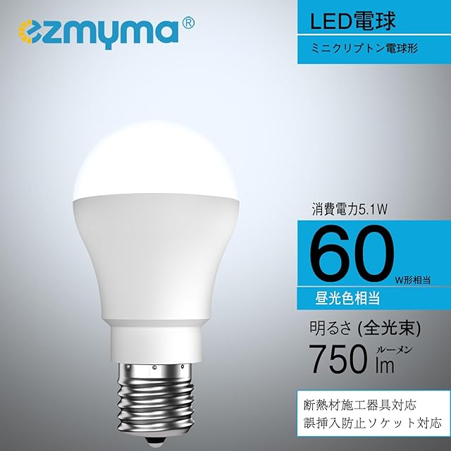 ミニクリプトン電球 LED電球 口金直径17mm 調光器対応 昼光色 60W形相当 広配光 2個セット 750lm 断熱材器具対応