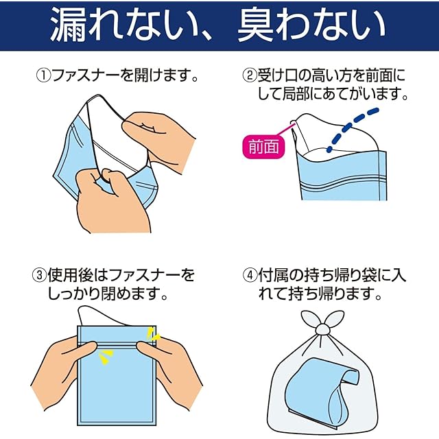 オシッコを素早く固め臭いを包む、持ち帰り袋と前掛けシートを付属した携帯トイレ(Z61)の3枚入り3個セット。