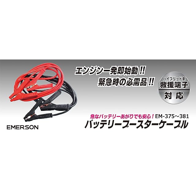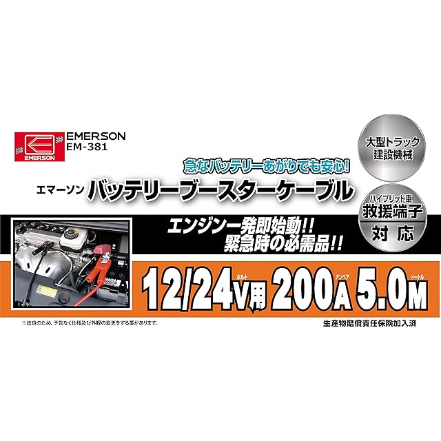 エマーソン(Emerson) 車用バッテリーブースターケーブル 12/24V 200A 5.0m ハイブリッド車救援端子対応 取っ手付き収納バッグ付き 【対応車種】軽自動車~大型自動車・24Vディーゼル車・4WD・RV車・2t~大型トラック・建設機械 EM-381