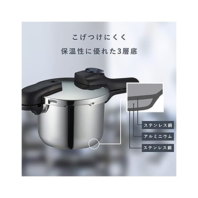材質:本体/ステンレス鋼、はり底/アルミニウム合金・ステンレス鋼、ふた/ステンレス鋼、取っ手/フェノール樹脂(耐熱温度150度)