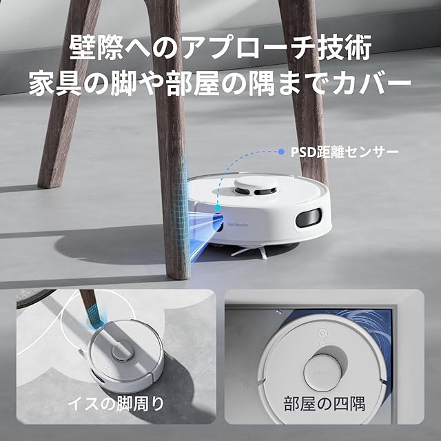 【環境感知がPro】PSD距離センサーを新たに増加。周囲の状況を把握し、家具やイスの脚などの障害物をスムーズに回避しながら手の届きにくエリアをすべてカバーします。また、高精度レーダーナビで360°全方位の環境と間取りを正確に認識し、あなたのお部屋を再現します。