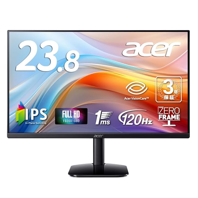 Acer モニター 23.8インチ フルHD 非光沢 IPS 120Hz 1ms(VRB) sRGB 99% AdaptiveSync HDMI 1.4 ミニD-Sub 15ピン スピーカー・ヘッドフォン端子非搭載 VESAマウント対応 ゼロフレームデザイン 3年(パネルは1年) KA242YG0bi