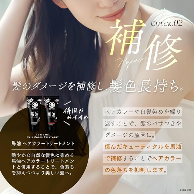 【馬油ヘアカラートリートメント】国産馬油配合のヘアカラートリートメント。徐々に白髪が染まるタイプ。傷んだ髪へ潤いを届け、艶やかな自然な髪色へと仕上げます。15種の保湿成分+うねりケア成分配合で、髪のパサつきやうねりが気になる方に。パラベン・鉱物油・シリコン・酸化剤・ジアミン系染料不使用。ツンとこないフローラルの香り。