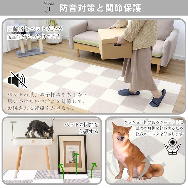 【床暖房対応・使いやすい】リビングや寝室はもちろん、キッチンのペット カーペット、玄関の汚れ防止マット、廊下の防音マットとしても使用可能。タイルカーペットは簡単にカスタマイズでき、どんな部屋のレイアウトにも対応します。さらに、地暖房間でも使えるので、寒い季節にも快適です