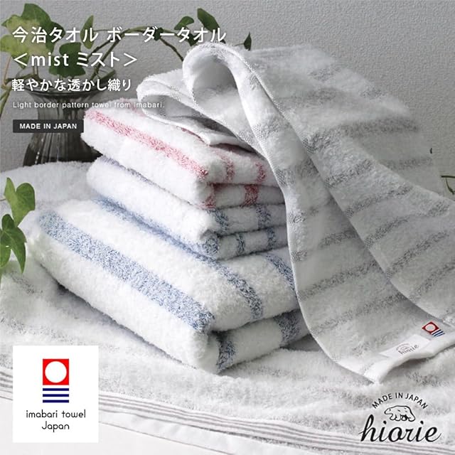 【薄手でもしっかり吸水】毎日使いやすくするため、やや薄手に織り上げています。それでも吸水性は今治タオルの厳しい検査基準をクリア。しっかり吸水してくれます。白いパイルの間からほんのりと霧がかって見えるやさしいボーダーラインが軽やかで、心地よくお使いいただけます。