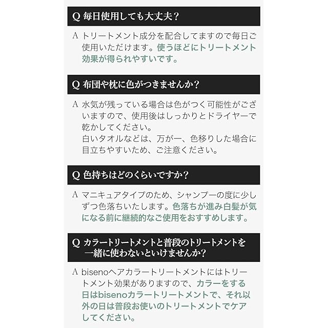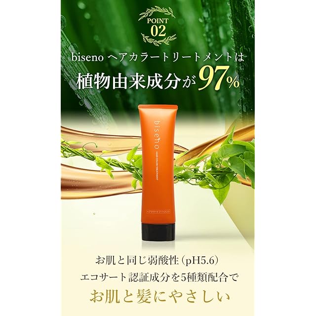 ✅【一般的な染毛剤との違い】bisenoは約97%が植物由来のオーガニックヘアカラー。ジアミン不使用で髪にも頭皮にも優しいのが特徴です。白髪染め特有のツーンとする嫌なにおいがなく、フローラルの香りに包まれてバスタイムを心地よくさせてくれます。使う度に徐々に髪色が変化するため髪を染めたことを気づかれにくいです。