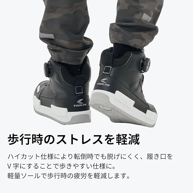 ストリートファッションに合うスニーカーのようなデザインながら、防水性能やプロテクターなどライディングに必要な機能を兼ね備えたライディングシューズ。アッパー内部にはTAICHIオリジナルの防水・透湿素材"ドライマスター"を採用し、全天候での使用に対応。着脱のしやすさと優れたフィット感を実現するBOAフィットシステムを採用。くるぶしまで覆うハイカットタイプで、転倒時でもシューズが脱げにくい仕様に。シューズ内外に配置されたプロテクターが足への衝撃を軽減します。