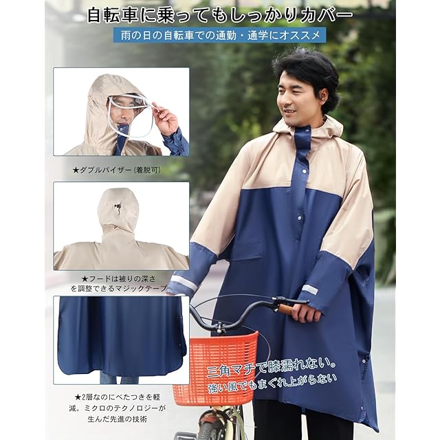 【2025新型・おしゃれ構造軽量で蒸れないレインコート】日常での使いやすさを重視し、街歩きや自転車運転で便利な機能が満載の快適・スタイリッシュなレインコートです。市場のレインコートと違って、弊店のレインコートは高品質のポリエステル素材を使用し、長年ご利用いただけます。自転車 原付におすすめ!リュックを背負ったまま着れる!雨の日でも安心安全な機能がもりたくさん:①16cm硬い二重つば:ツバは硬い素材で加工され、顔を覆ってなくて視界が良好です!②超軽量素材,収納袋付き、持ち運びに便利!③フードにはサイズを調節可能なドローコード仕様:頭のサイズに合わせて調整可能。また雨水の侵入も防止します。④前身頃に大きめなポケツトを2個デザインで、ちょっとした小物や折りたたみ傘の収納にも便利。⑤横身には切り上げデザインを使用し、リュックを背負ったままでも自転車をこいいただけます。そして夜間外出にも安全な反射ラインがついております。