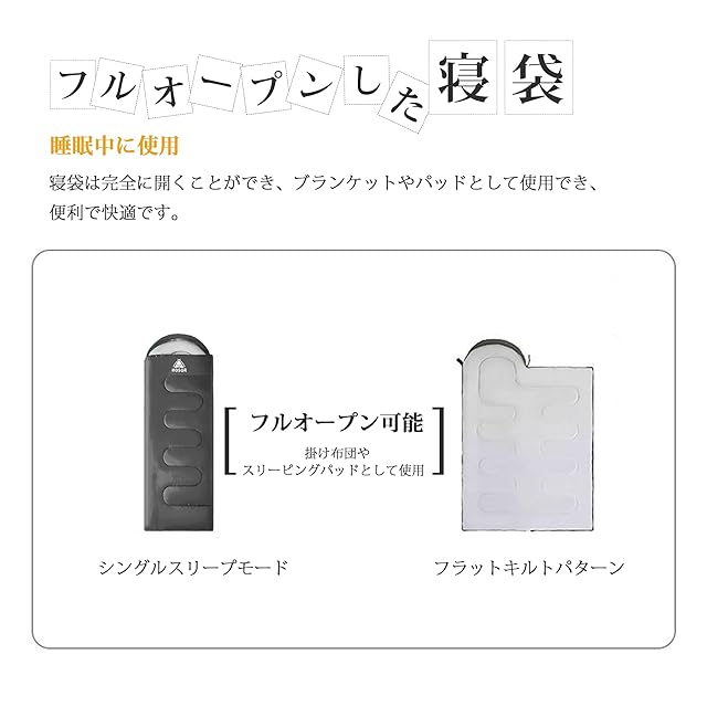 【優れる素材】表地:耐水性と耐引き裂き性素材。 中綿:防寒性が優れいるポリエステル100%、 保温性能が高いです。裏地:上質な繊維素材で質感がよく、ふとんのように柔らかくて肌触りがよい、寝袋に入った時すぐに温かみを感じることができます。