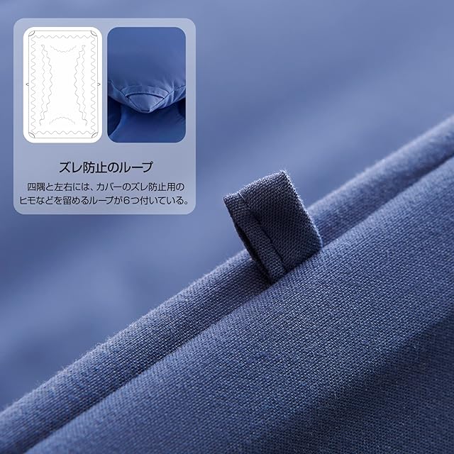 【ピーチスキン加工、やわらかくしっとり触感】肌に優しいピーチスキンの触り心地でしっとり気持ちよく、ムレにくく快適です。ほこりが出にくい、綿切れしにくい、中空ポリエステル綿を使用。ズレ防止ループ付き端の8ヶ所にズレ防止用ループが付いているので、お布団がズレる心配もありません。