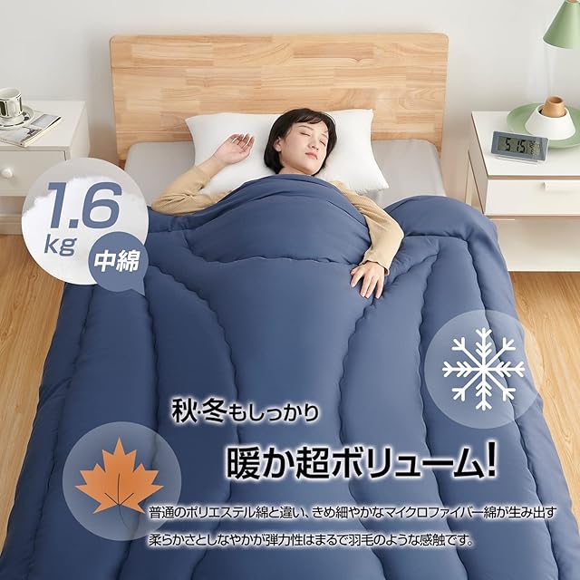 掛け布団 シングル 冬 かけ布団 洗える かけふとん オールシーズン 掛けふとん 柔らかな肌触り 肌掛け布団 軽量 通気 抗菌防臭 SEK認証 Ag+銀イオン抗菌素材 アレルギー対策 150x210cm ネイビー(中綿1.6kg)