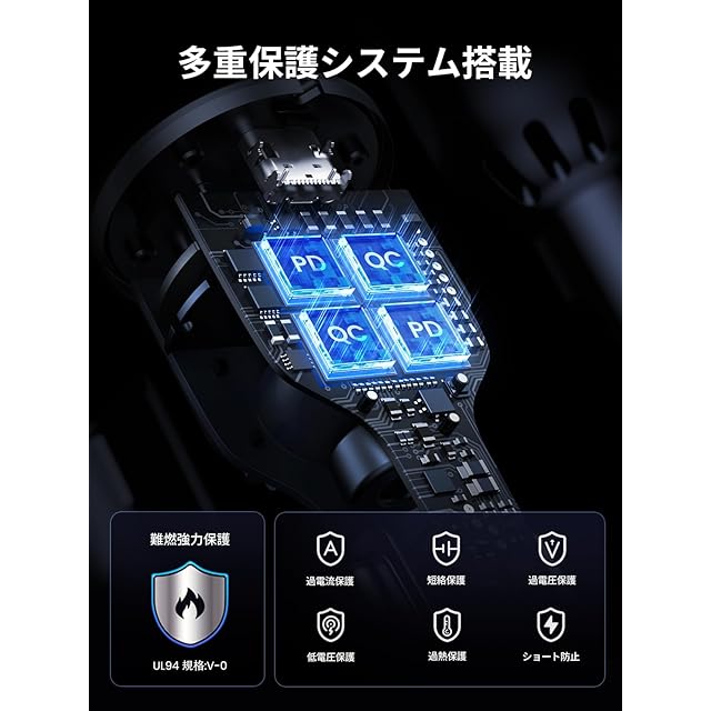 【多重保護システム搭載】このシガーソケットはサージ保護機能や電子回路のショート防止機能、温度管理、過充電保護、過電流防止など多重保護システムにより、パワフルかつ安全に充電可能で長期間お使いいただけます。