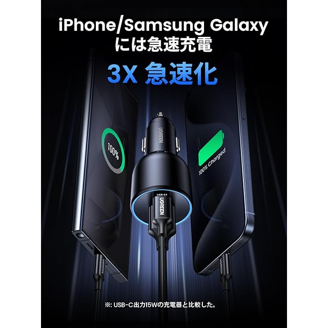 商品名:UGREEN 130W シガーソケット usb-c カーチャージャー 3ポート【PD 100W/30W+SCP 22.5W】PD3.0/QC4.0/PPS対応 車載充電器 コンパクトサイズ 耐久性 シガーソケット 急速充電器iPhone 14/13/12, Galaxy S22/S21 Ultra, iPad, MacBook,ラップトップなどに対応 【ケーブル付属なし】