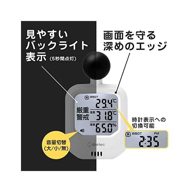 ドリテック(dretec) 【熱中症対策】黒球式熱中症計 温湿度計 時計付き 熱中症指数 WBGT アラーム バックライト 消音 室内 屋外 デジタル 日本メーカー JIS B 7922:2023 適合品