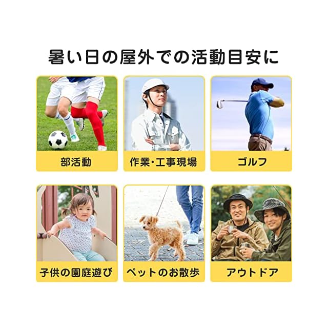 工事現場、スポーツ、農作業、アウトドア、ペットの散歩、通勤・通学、小さな子供の園庭遊びの目安など屋外での使用にぴったり。屋内への計測切替ボタンも搭載されているので、室内の熱中症管理にも役立ちます。