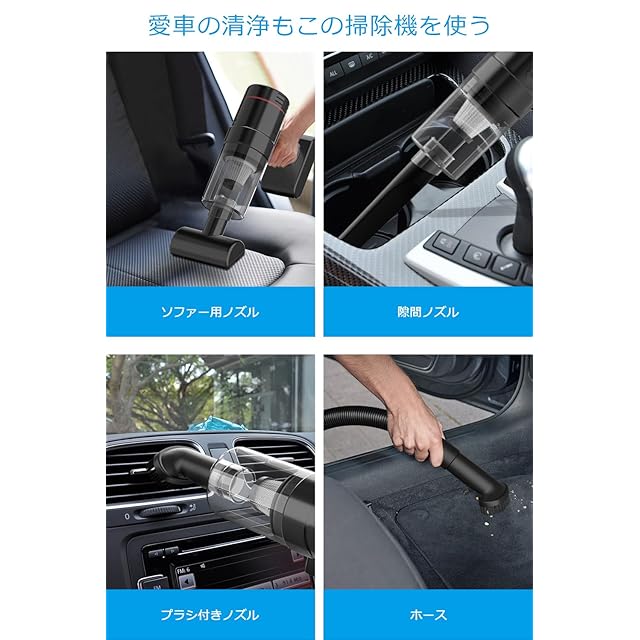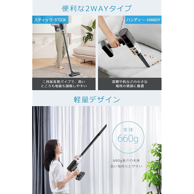 【多機能アタッチメントで様々な清掃ニーズに対応】この掃除機には、豊富なアタッチメントが付属しており、床用ノズル、隙間ノズル、ブラシ付きノズル、延長パイプ、ソファ用ノズルなど、様々な清掃シーンに対応します。90°から180°まで調整可能な清掃角度により、あらゆる場所の清掃が簡単です。また、スティッククリーナーとしてもハンディクリーナーとしても使用可能な2WAY仕様で、使用場所に応じて最適な使い方が選べます。家庭やオフィス、車内など、どんな場所でも快適に使えるデザインで、清掃作業を楽に行えるのが特徴です。これらの多機能アタッチメントを使って、隅々まできれいにしましょう。