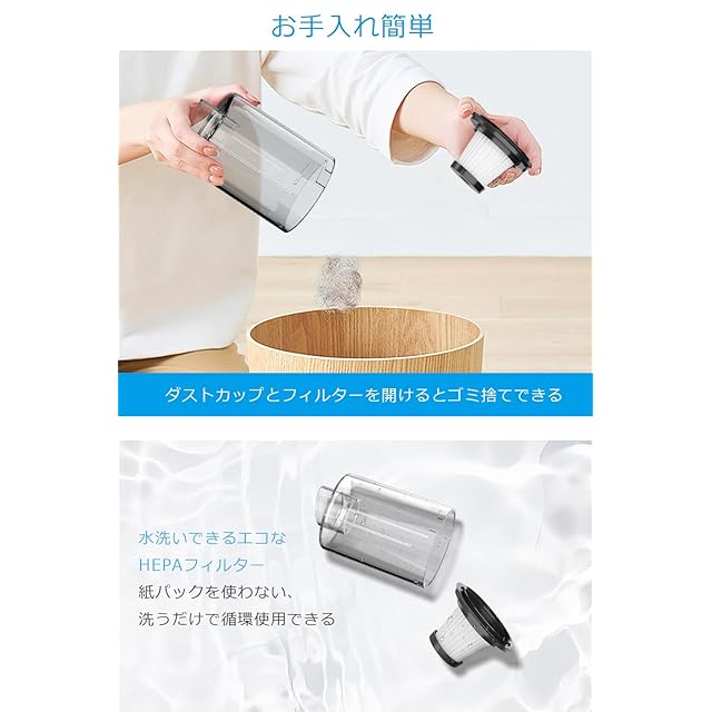 【大容量ダストカップで手間いらず】この掃除機には、透明な200mlの大容量ダストカップが搭載されており、ゴミの量を一目で確認できます。ゴミがいっぱいになる頻度が少ないため、掃除中の手間が省け、効率的に掃除が進められます。ダストカップは取り外しが簡単で、水洗いも可能なので、いつでも清潔な状態を保てます。掃除後もダストカップの中のゴミをすぐに捨てることができるため、手間をかけずに清潔を維持できます。視認性の高いデザインは、ゴミの溜まり具合をリアルタイムで確認でき、掃除の効率をさらに高めます。
