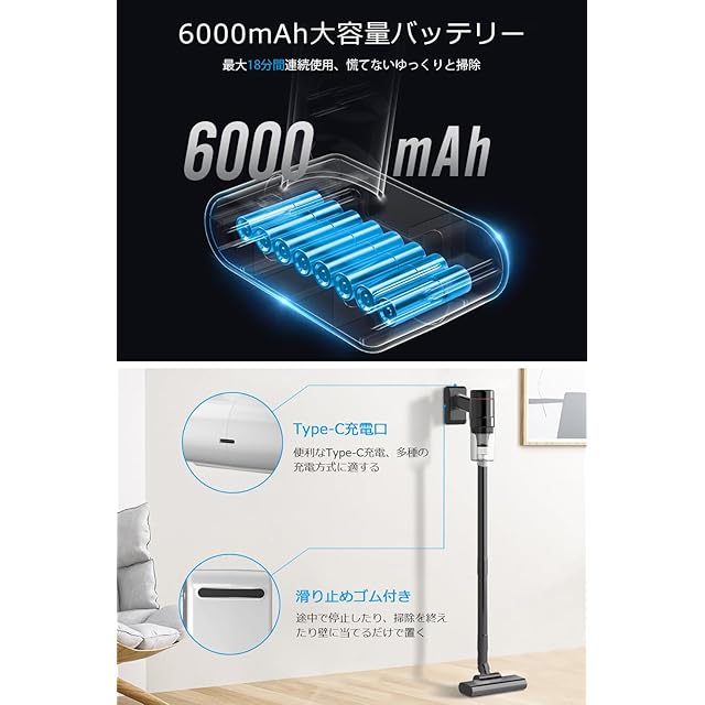 【長時間使用可能なバッテリーと静音設計】この掃除機は、6000mAhの大容量バッテリーを搭載しており、最大で35分の連続使用が可能です。一度の充電で家全体の掃除が完了するため、充電時間を気にせず使用できます。さらに、低騒音設計により、早朝や深夜でも周囲に迷惑をかけることなく、静かに掃除が行えます。パワフルながら静かな運転音は、日常の騒音ストレスを軽減し、家族や隣人を気にせず快適に使用できるのが魅力です。多重フィルターシステムが微細なホコリやアレルゲンを確実に捉え、清潔な空気を排出します。