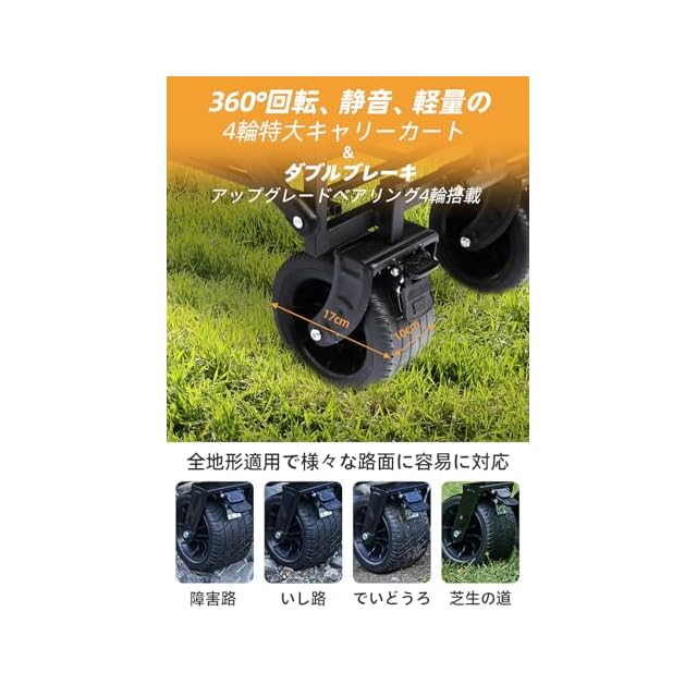 【多機能な大型タイヤ&ブレーキ搭載】このキャンプカートは直径17cm・幅10cmの極太タイヤを備え、ベアリング内臓で静かで安定した走行が可能。平坦な場所はもちろん、砂浜や砂利道、芝生などの凸凹道もスムーズに移動できます。他に類を見ないブレーキ機能付きで、坂道も安心。ダブルフロントブレーキと特大の360°回転ホイール(幅:10cm、直径:18cm)は斜面、芝生、ビーチ、凹凸のある地面にも対応。取り外し可能な大型タイヤは省スペース収納可能で、いつでもタイヤ交換が可能。あらゆる地形で安定した移動とブレーキの便利さを備えた、多機能なキャリーカートです。