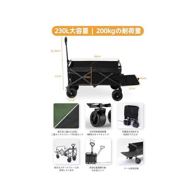 【大容量&驚くほどコンパクト収納】理想的なアウトドアワゴンとして、驚きの230Lの大容量、200KGの耐荷重を誇ります。野外用品、食品、その他の必需品を一度に効率的に持ち運ぶための理想的な選択肢です。キャリアの高さは34cmで、使用時のサイズは奥行75x幅46x高さ48 cm、収納時のサイズは奥行47x幅14x高さ66 cmです。この製品は、キャンプやファミリーピクニックなどの屋外活動に欠かせないもので、大容量でありながらもコンパクトな設計なので、必要なものをすべて効率よく持ち運ぶことができます。