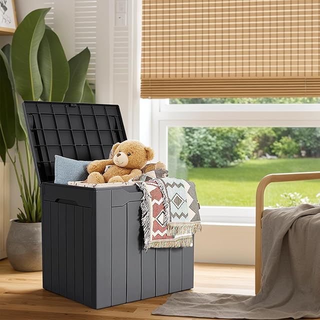 「お洒落な木目調デザイン」:収納箱の表面は天然の木に近い木目模様のデザインが施されています。お洒落なデザインでありながら、箱からは自然な温もりが感じられます。このお洒落は、室内にも、お庭や屋外にも馴染みやすく、置くだけでお洒落な印象を演出します。