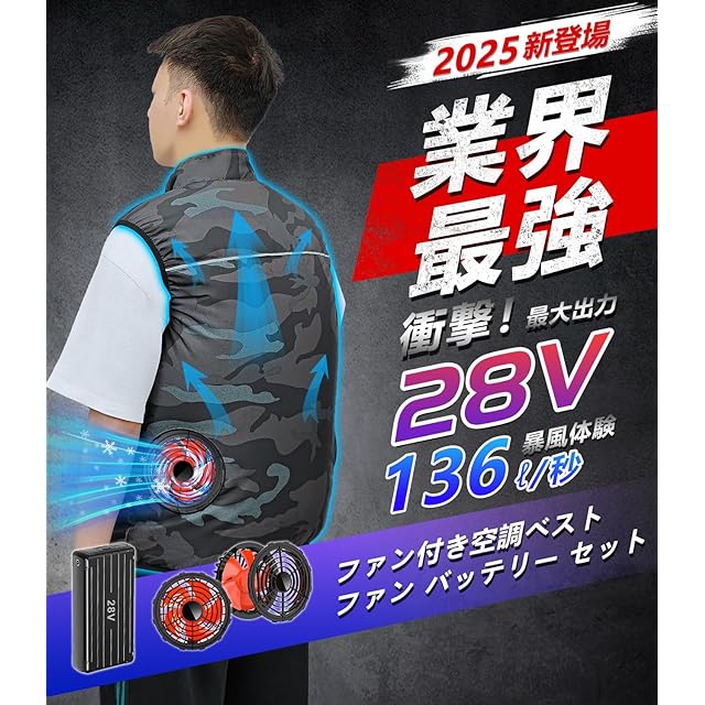 【驚異の136L/S爆風&4段階風量調節】2025年新型ハイパワーファン空調ベスト登場します。上質な高密度ABS素材、高性能全銅芯ブラシレスモーターを採用し、圧倒的な省エネ性能を実現しています、回転音が気にならない静音設計です。空調ウェアの付属のファンは最多の5枚羽タイプを使用。風力がパワフルなのに静音でストレスフリーの心地良い風を生み出します。スイッチを入れると瞬時に空調ウェアが膨張し、腹部から背中まで一瞬のうちに風が巡り、首元まで風が巡って気持ちいい! 夏の猛暑を忘れてしまうほどの快適な涼しさを得られます。28V高出力リチウムオンバッテリーと組み合わせることによって、「最強風ー強風ー中風ー弱風」4段階の風力が調節でき、炎天下での作業時に体感温度を最適化にすることで、実用性と便利性を兼ね備えたアイテムです。