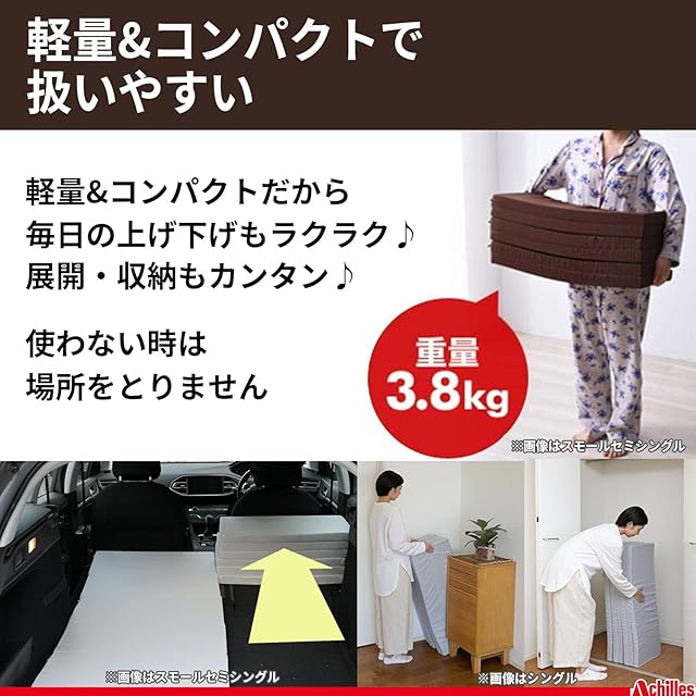 ●本体サイズ:幅80×長さ180×厚み4cm●折りたたみ時サイズ:幅80×奥行30×厚み24cm●重さ:3.9kg●材質:中材=ウレタンフォーム、側地=ポリエステル100%●ウレタン密度:60kg/m3●ニュートン数:265N(A法)●原産国:日本(側地:中国製)