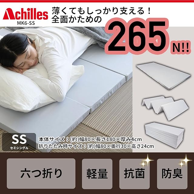 [アキレス] マットレス 折りたたみ 硬め 高硬度(265N) 腰痛 セミシングル (幅80×長さ180㎝) 抗菌 消臭 厚み4㎝ 車中泊 災害 ごろ寝 6つ折り コンパクト グレー MK6-SS GY