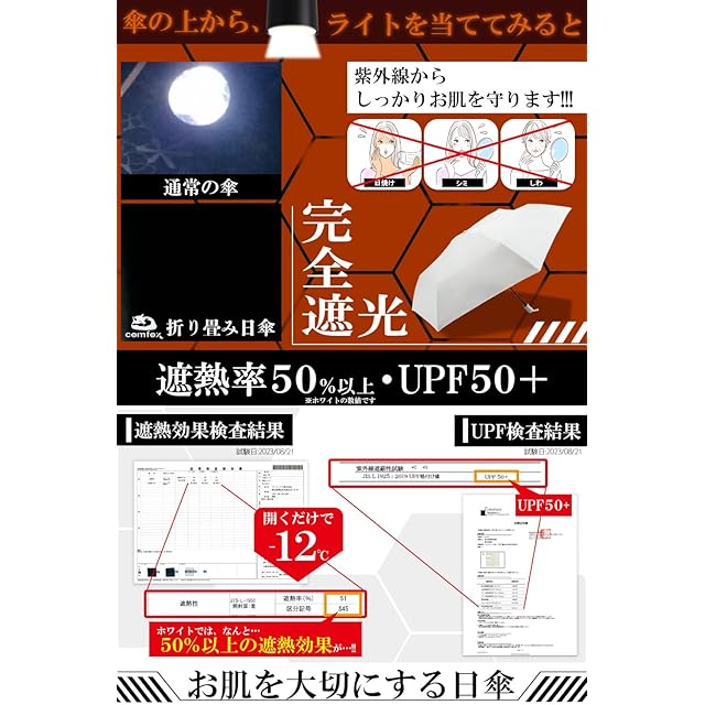 ✅【 プレゼント 贈り物 としても選ばれております!】誕生日、などの プレゼント ギフト に是非岡山県メーカーcomfoxがプロデュースした折り畳み日傘をご活用ください! ✅【comfoxは商標登録済(登録6689599)の「岡山県ショップ comfox 」オリジナル商品です】類似品(デザイン、カラー)にご注意ください。 ✅【当店は、少人数で運営している地方のECショップです】少人数だからこそできることがあります!どんな些細な事でもお気軽にお伝えくださいませ!誠心誠意対応させていただきます! ※検査機関詳細国内2機関(紫外線技術センター/ 証明番号DTTR2023082103-2,102-2,101-2/試験日5.8.21)(ボーケン品質評価機構/証明No.25023003262-1/試験日5.8.21)海外機関(SHENZHEN NANZHIFU INDUSTRIAL/レポートNo.A2230395284101/試験日5.8.11)