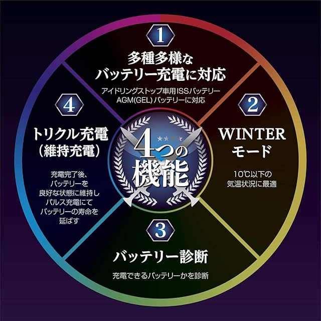 充電機能 : 全自動充電・パルス充電・トリクル充電(維持充電)・バッテリー診断 ・充電方式 : 定電流低電圧/オート充電方式 ・表示 : LED表示(充電レベル・エラー)