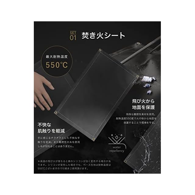 ・素材:シリコン加工ガラス繊維。シリコン加工によって、ガラス繊維特有の手に感じるチクチクとした痛みはなく、手触りが良いためガラス繊維が苦手な敏感肌のユーザーにおすすめです!また撥水性もあるので地面が濡れた場所でも使用可能で水洗いもできます。・縫製に使用する糸も難燃性のものを使っているので糸の部分に火の粉が落ちても意図が切れることはありません。