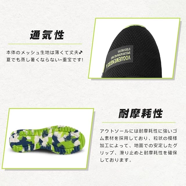 【耐滑・耐摩耗性】:作業靴として、耐摩耗性に優れたゴム素材と滑りにくさを考慮したアウトソールを採用します。底も滑り止めデザインで加工しています。