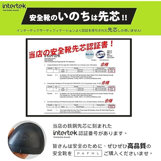 【鋼先芯・つま先保護】:弊社の安全靴は鋼製先芯入りで、金槌の衝撃や刃物の落下など作業中の事故からつま先をきちんと保護できます。JSAA A種相当の高品質先芯を採用するため、安全性ばっちり!