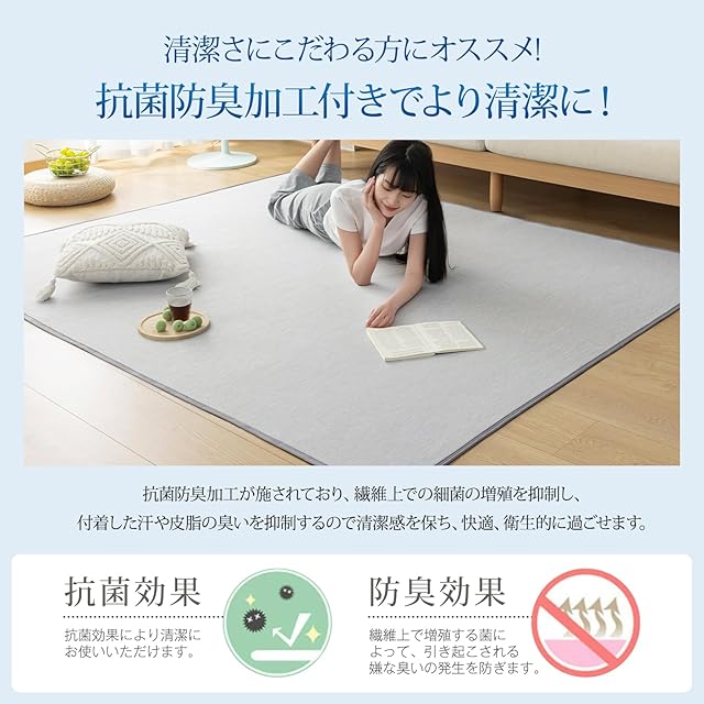 【滑り止め・抗菌防臭加工】「歩くたび、掃除機をかけるたびにラグがズレてストレス…」そんなお悩みを解消するため、このラグには滑りにくいドット加工を施しました。お子さまが走り回ってもズレる心配がないので、安心してお使いいただけます。また、肌に直接触れるラグだからこそ、抗菌・防臭加工で菌の繁殖やニオイを抑制。いつでも清潔で快適にお使いいただけます。