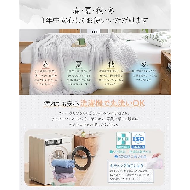 【当社新開発した:親水性繊維×マイクロわた】もちっとふわっと、さらっと快適!新開発の親水性繊維とマイクロわたの組み合わせで、軽やかでふわふわな掛け心地を実現。繊維の間にたっぷりと空気を含み、体を優しく包み込みます。自重の150倍の吸水力を持つ親水性繊維が、汗や湿気を素早く吸収・発散。調湿効果で、季節を問わず快適な寝心地をお届けします。