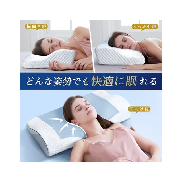 【どんな寝姿勢でもラクラク】中央のくぼみと両側カーブの設計により、しっかりと頭、首、肩をやさしく支えています。仰向けに寝る場合、頭と首への圧力が軽減し、寝姿勢が安定します。また、枕の両側が高くしたので、横向きで寝ると自然に頭が上がり、重心が真っすぐになり、気道が確保され呼吸が楽になります。