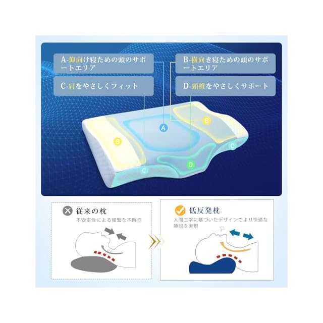 【頭·首·肩を自然にサポート】人間工学に基づいたデザインにより、寝ている間にネックのカーブを自然に保て、首をやさしく支えてくれます。低反発枕は4つのエリアに分かれており、頭が安定し、頭部への負担をかけず、快適な睡眠を実現します。