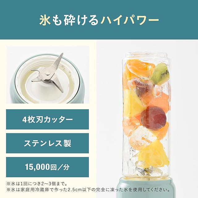 4枚刃のカッターは、氷(※1回につき2~3個まで)も一緒に砕くことができます