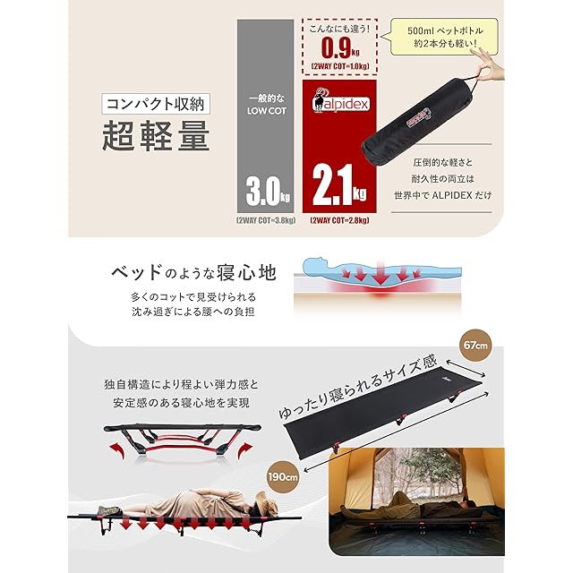【ドイツ発×欧州×ローコット】ALPIDEX (アルピデックス) 世界最軽量クラス2.1Kg(3分で簡単に組み立て可能) キャンプ コット 軽量 コンパクト ワイド 幅広 (ローコット ブラック)