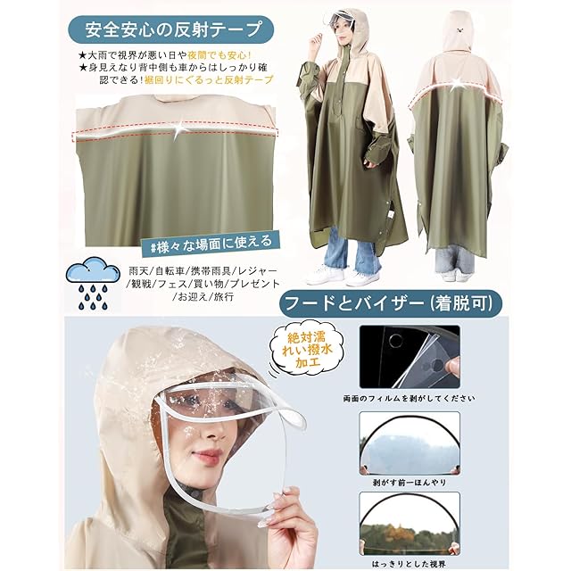 【2025新型・おしゃれ構造軽量で蒸れないレインコート】日常での使いやすさを重視し、街歩きや自転車運転で便利な機能が満載の快適・スタイリッシュなレインコートです。市場のレインコートと違って、弊店のレインコートは高品質のポリエステル素材を使用し、長年ご利用いただけます。自転車 原付におすすめ!リュックを背負ったまま着れる!雨の日でも安心安全な機能がもりたくさん:①16cm硬い二重つば:ツバは硬い素材で加工され、顔を覆ってなくて視界が良好です!②超軽量素材,収納袋付き、持ち運びに便利!③フードにはサイズを調節可能なドローコード仕様:頭のサイズに合わせて調整可能。また雨水の侵入も防止します。④前身頃に大きめなポケツトを2個デザインで、ちょっとした小物や折りたたみ傘の収納にも便利。⑤横身には切り上げデザインを使用し、リュックを背負ったままでも自転車をこいいただけます。そして夜間外出にも安全な反射ラインがついております。